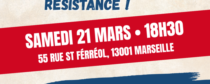 Rendez-vous : Samedi 21 mars à 18h30 au 55 rue Férréol 13001 Marseille.Cette initiative est co-organisée avec l’UL CGT Marseille-Centre et Union Palestine Marseille.