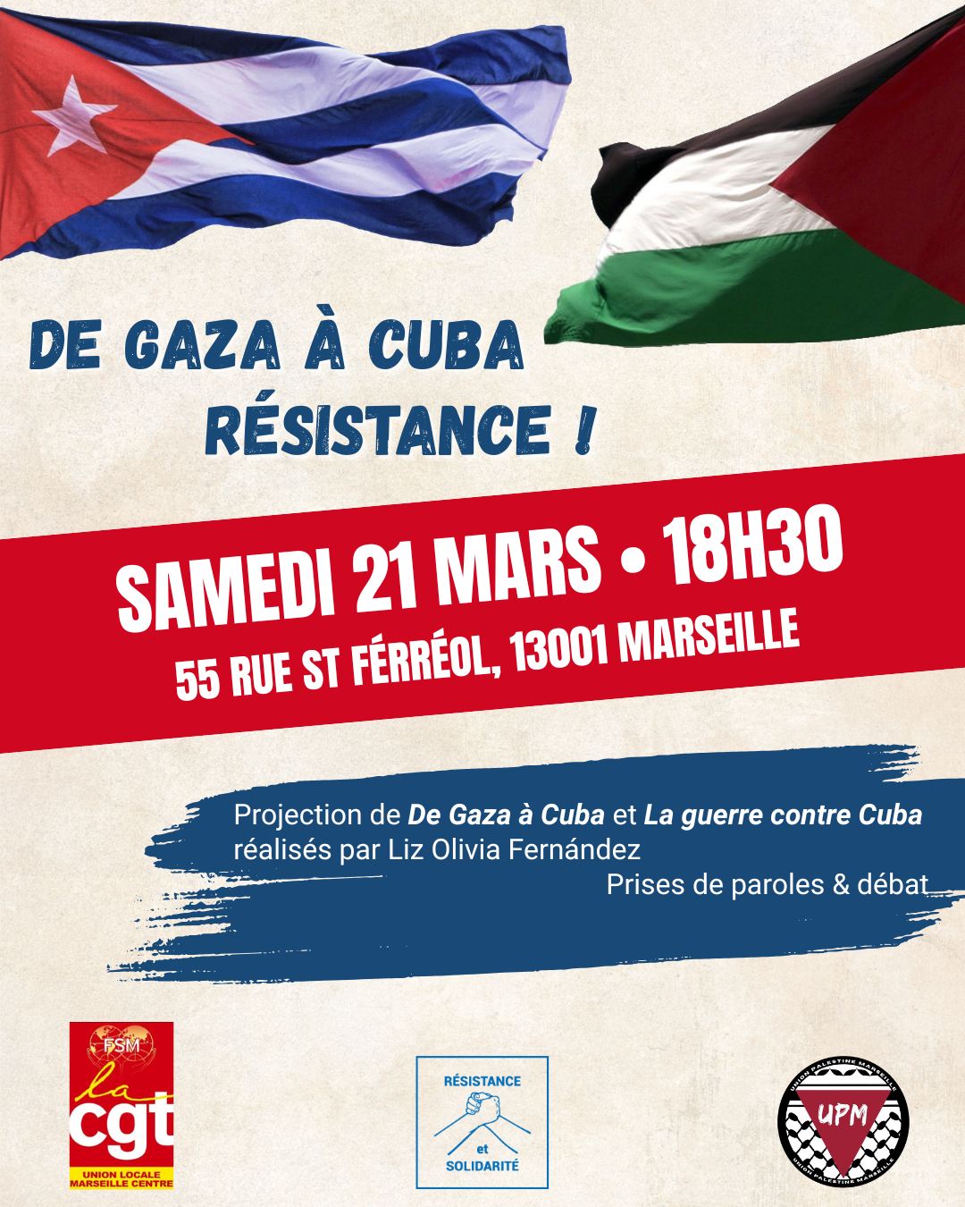 Notre première étape de la Caravane pour Cuba s’arrête à Marseille. Rendez-vous le 21 mars dans les locaux de l’UL CGT Marseille-Centre pour une soirée qui reviendra sur les agressions impérialistes contre les peuples palestinien et cubain, mais aussi sur les mécanismes de solidarité entre ces deux peuples amis.