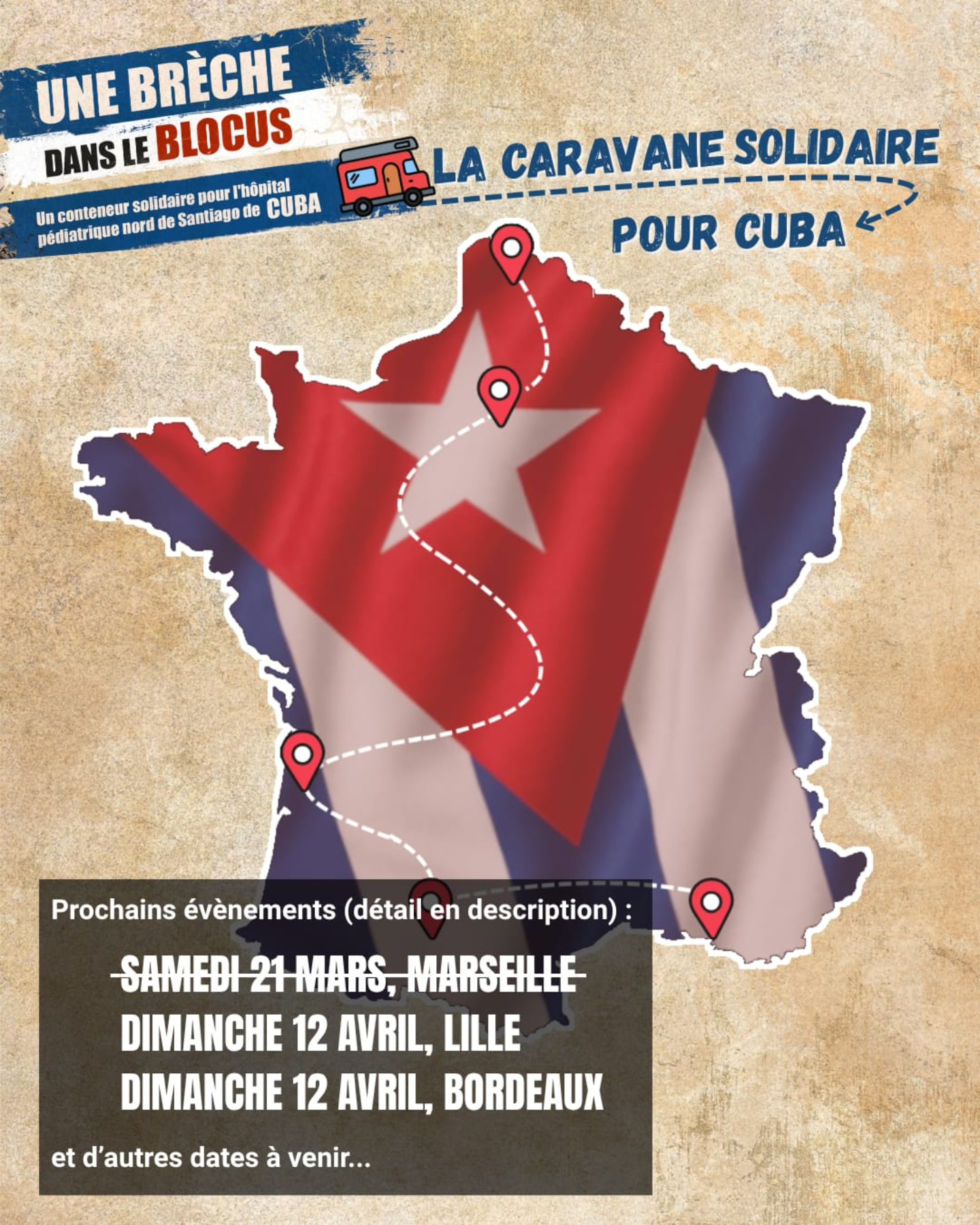 La caravane pour Cuba ce sont des évènements organisés partout en France, par notre association ou en partenariat avec d’autres organisations, autour de la campagne de solidarité avec Cuba ‘Une brèche dans le blocus’. Elle vise à collecter fonds et matériel médical afin d’acheminer un conteneur à l’hôpital pédiatrique Juan de la Cruz Martínez Maceira de Santiago de Cuba.